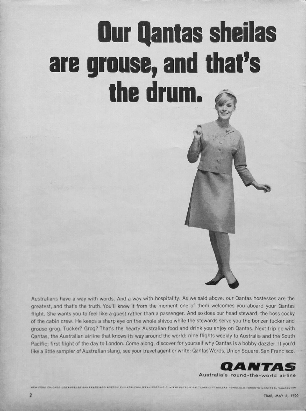 Grouse was first mentioned in the Sunday Times in Sydney in 1924 before the Popular Dictionary of Australian Slang made grouse an offical slang term in 1941. Speaking of sheilas, Qantas even used both 'grouse', 'sheila' and a whole stack of slang words in an educational marketing campaign aimed at Americans in the 1960s. Grouse!